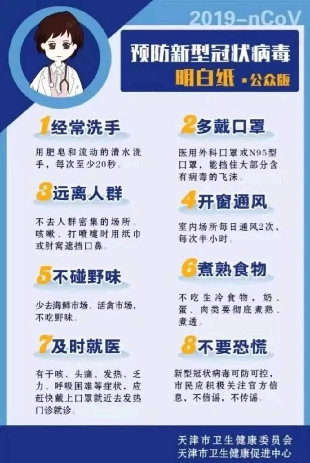 一、主动阻断移动感染源。少出门,少聚集,避免在人员密集区或封闭、空气不流通的公众场所逗留。如近1个月到过武汉,请主动居家隔离14天,出现发热、咳嗽等症状,请第一时间戴好口罩到天津市卫健委指定发热门诊规范就诊,不要到其他科室。就诊时请主动告知医生武汉旅居史。并及时将医生诊断结果向班主任报告。