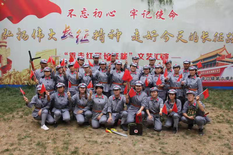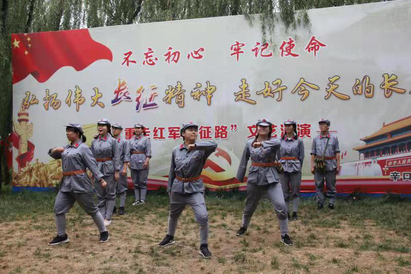 在第六埠村党群服务中心院内,参加活动人员身着红军装,整齐列队,聆听长征历史,重温入党誓词。随后,区残联理事长为残联队伍、启智学校队伍、残疾人专职队伍授旗。走上“长征路”,突破“四道封锁线”“四渡赤水”“勇渡大渡河”“飞夺泸定桥”一段段长征历史重现眼前,大家一边听取讲解员的精彩讲解,一边亲身体验长征过程,“爬雪山”“过草地”,老师们相互鼓励,共同完成了五公里的“长征路”,达到三军大会师地点。三军大会师文艺表演舞台上,青年教师表演了诗朗诵《七律.长征》,高亢激昂。缅怀先辈们的卓越功勋和丰功伟绩;全体教师合唱《我和我的祖国》,不忘初心跟党走,感恩奋进做好特教事业。