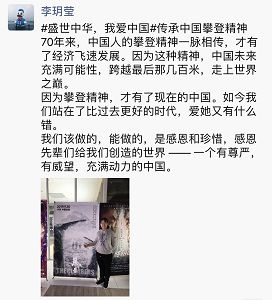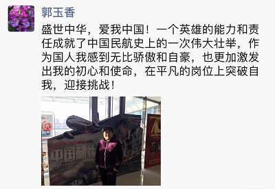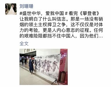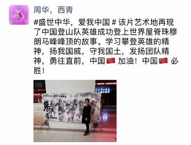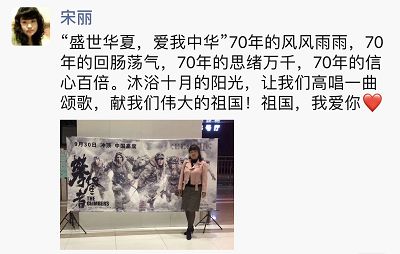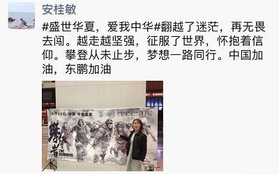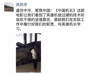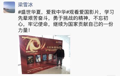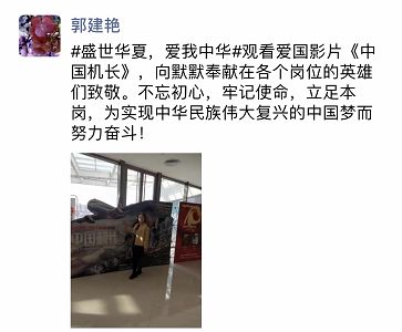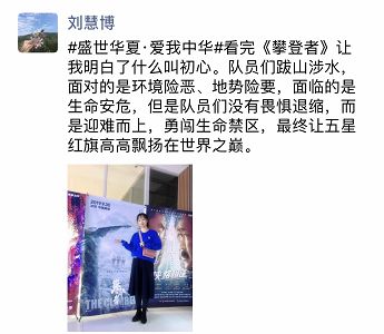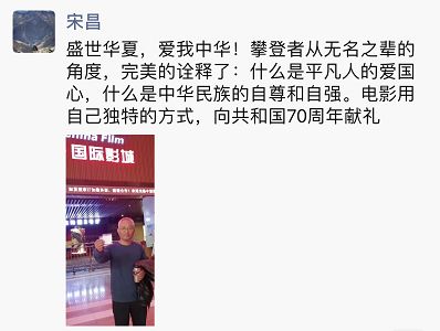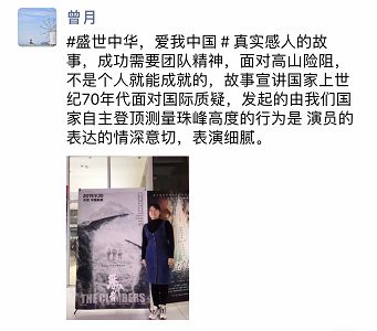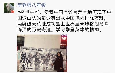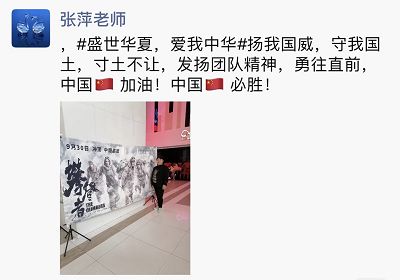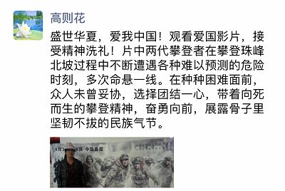 本次活动得到了广大教职员工的积极响应,大家纷纷去到影院兴致勃勃的观看了这三部爱国影片,对影片《我和我的祖国》中的七个主人公在各自的岗位上为了祖国为了人民奉献的崇高精神深受感染;对《中国机长》中刘长健及整个机组成员临危无惧,敢于担当的气势十分钦佩;对《攀登者》中我国首次从北坡登顶珠峰成功的兴奋之情印象深刻。纷纷在自己的朋友圈里留下了第一时间的感受,以下是教师们的感想: